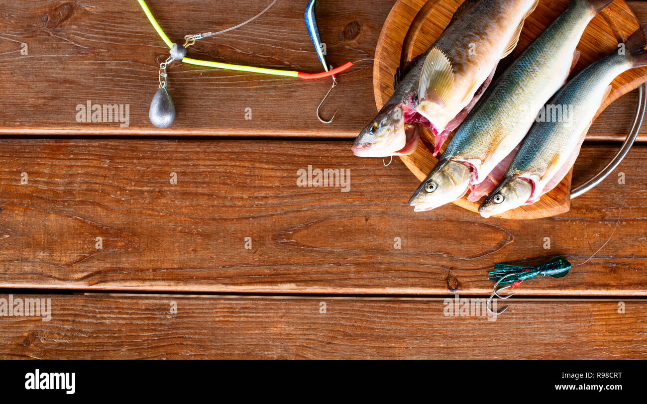 Banner Fresh Sea Fish Catch Lies On A Cutting Board On A Wooden